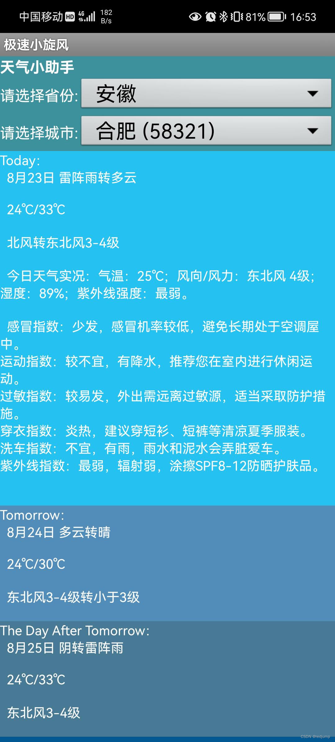 原理:获取支持的省份->获取支持的城市->按城市编号调用webservice->返回23个string拼接展示