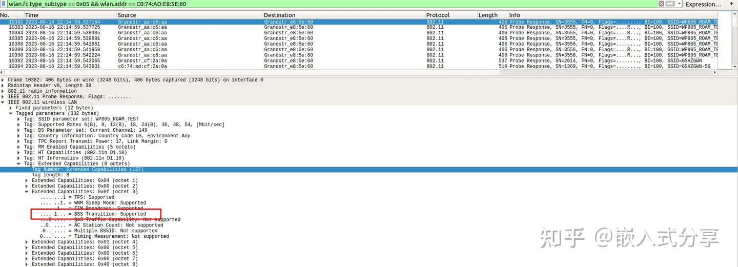 1、 首先要看AP支持不支持,AP发出的Probe Response帧(wlan.fc.type_subtype == 0x05)中的Extended Capabilities字段下可以看到BSS Transition support值是否被置为1