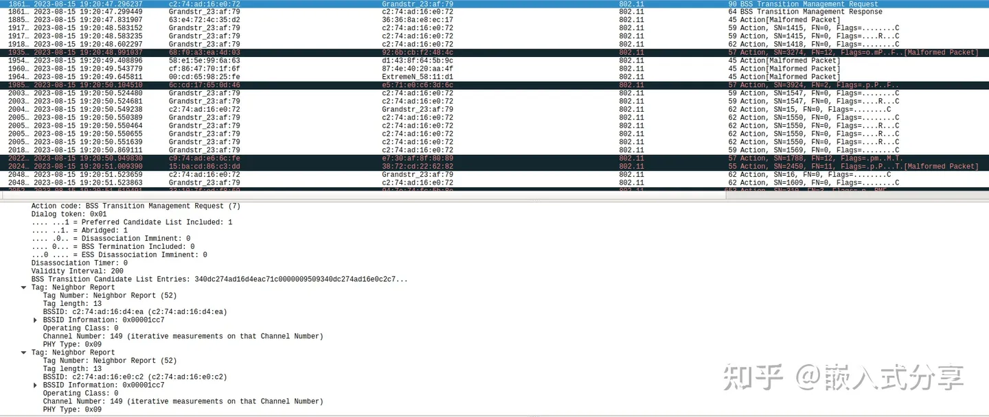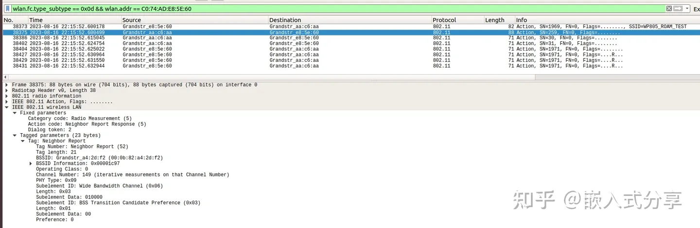 3、无线终端从远端一个AP到另一个近端AP移动时,AP会主动发送btm request (wlan.fc.type_subtype == 0x0d)或者(wlan.fixed.category_code == 10)