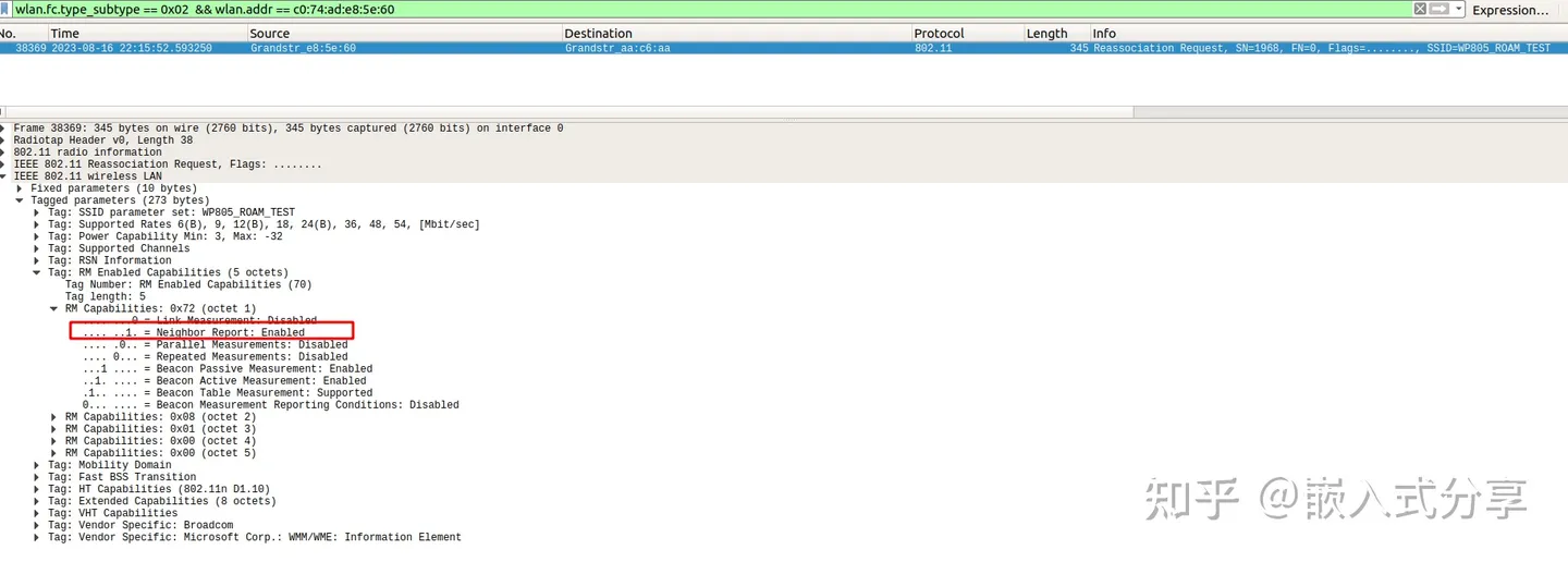2、其次要看无线终端支不支持,看设备发出的Reassociation Request帧(wlan.fc.type_subtype == 0x02)或者看association Request帧(wlan.fc.type_subtype == 0x00)中的RM Enable Capabilities字段下可以看到Neighbor Report值被置为1