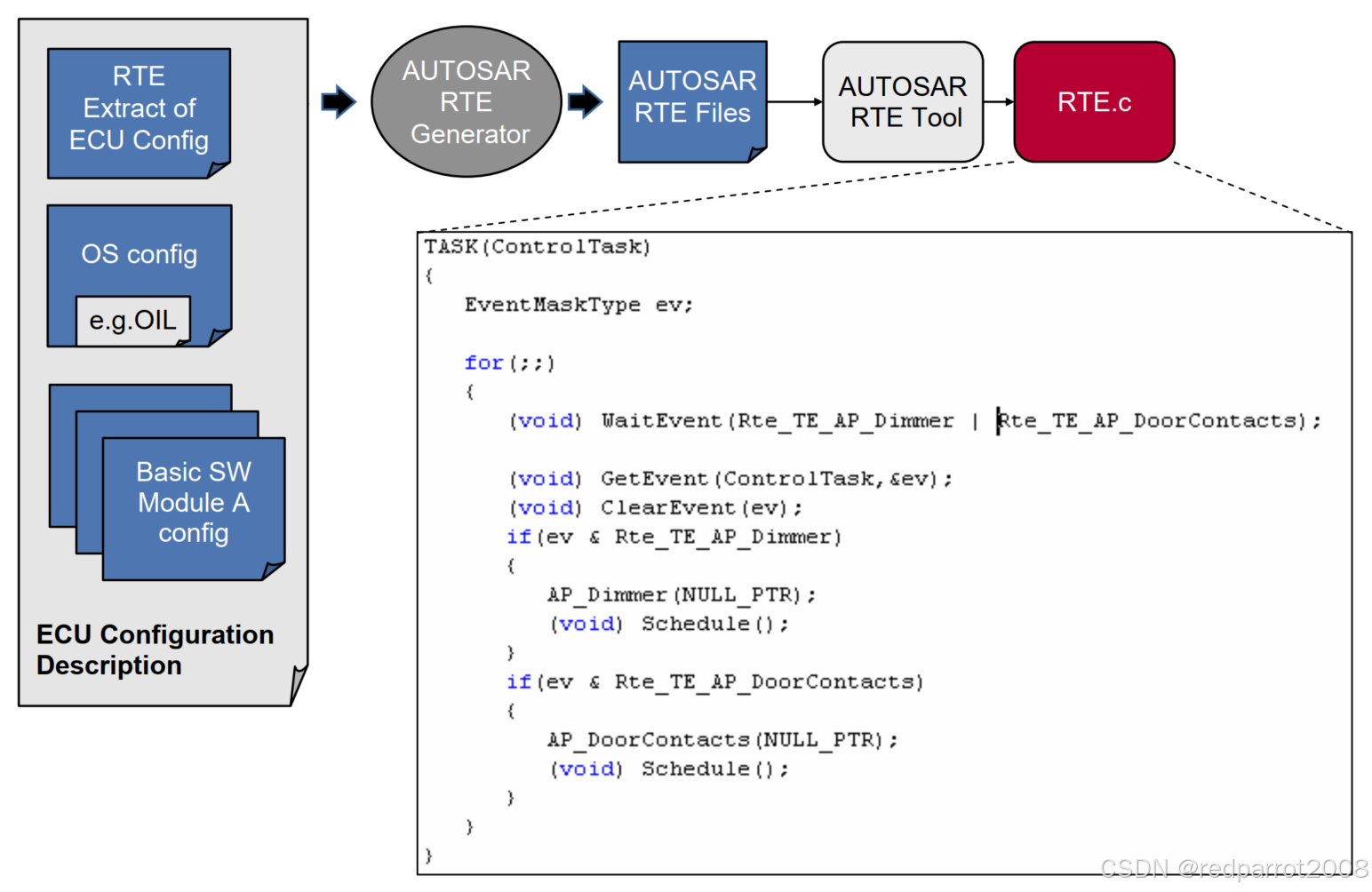 提供对runnable的管理功能(触发、唤醒等,简单说就是runnable需要映射到OS的Task上运行,而这个映射就是通过RTE具体实现的),之前提到了VFB(虚拟功能总线),RTE就是VFB的具体实现在Vector的工具链中,RTE是自动生成的。