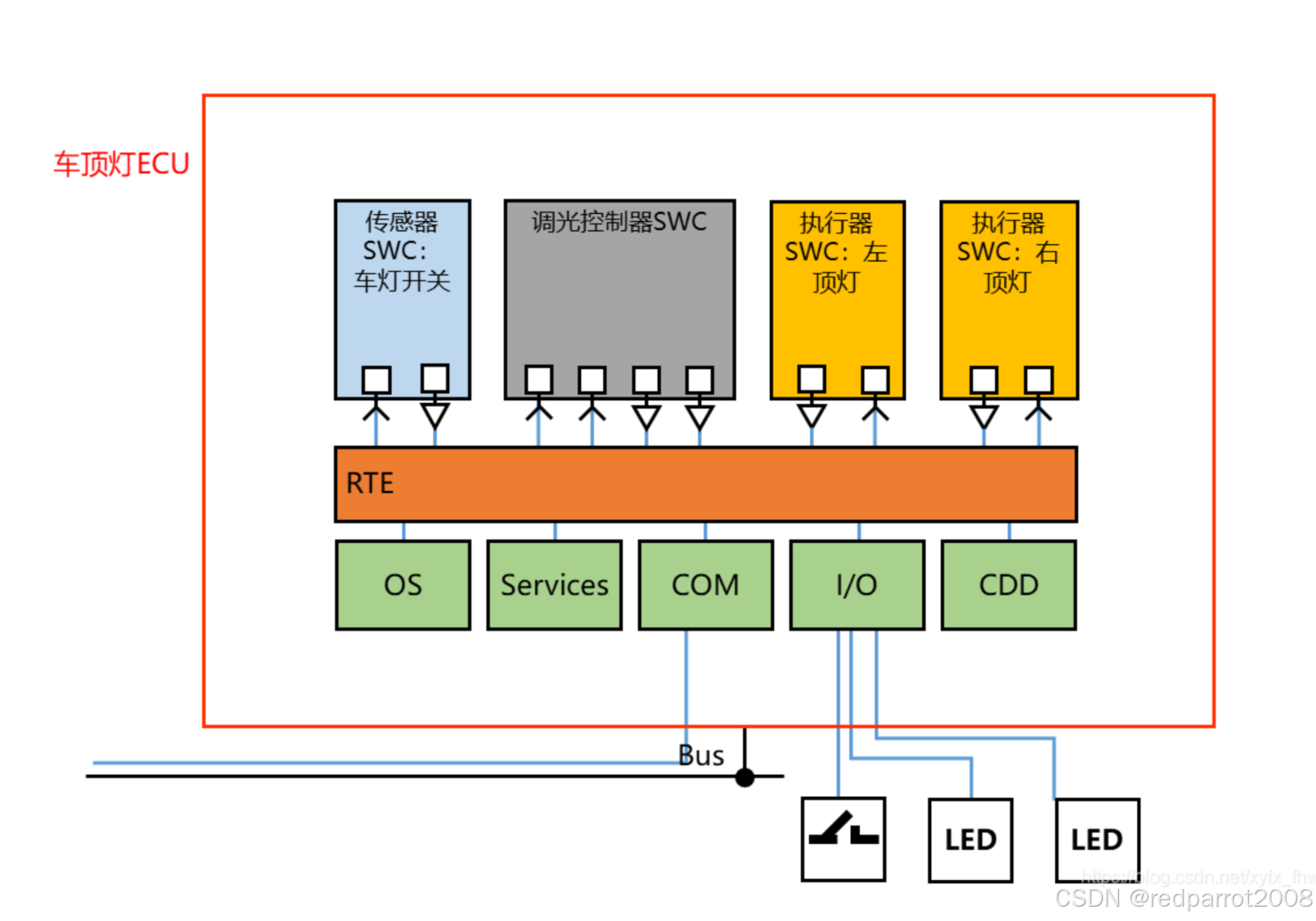 需要特殊说明一点的是:下图中两个红圈中的箭头,OS和COM是唯一的两个标准接口允许直接和RTE相连的。因为RTE的很多功能是需要基于这两个模块来实现的。