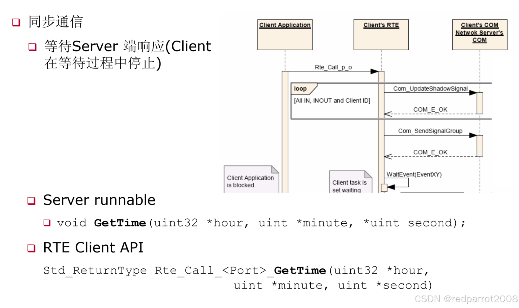 同步就是说我这个人很懒,我要等服务端运行完了这个函数,RTE返回这个函数的结果后,我才开始继续我的工作;