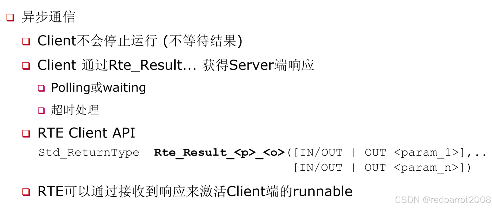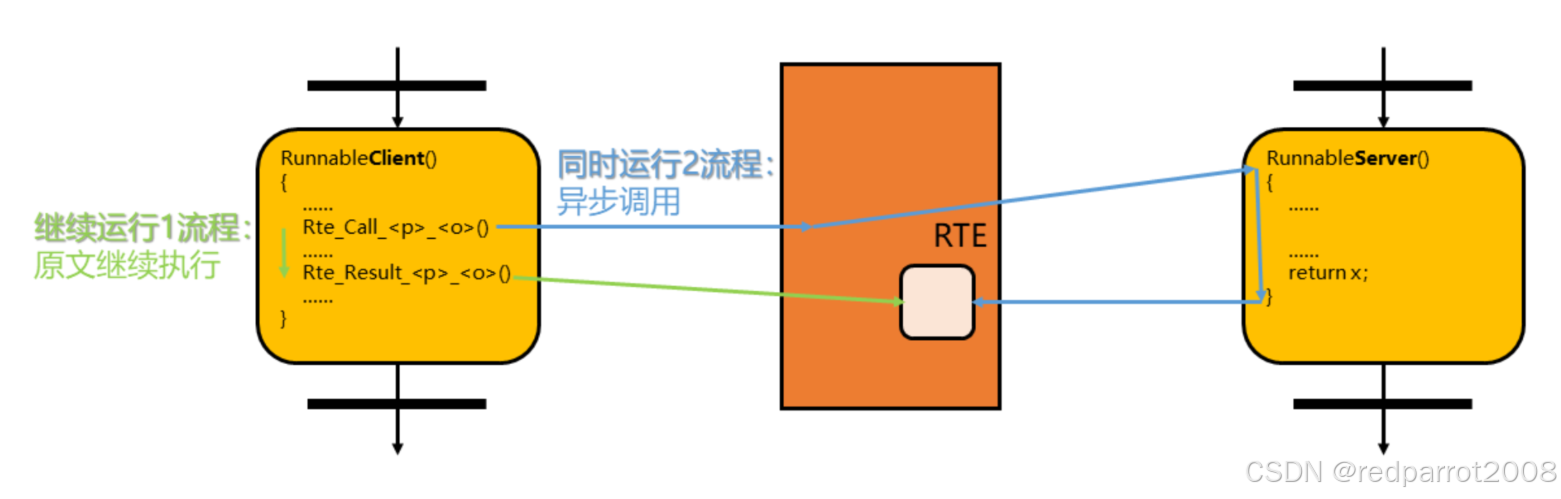 事件触发,当服务函数运行结束,RTE可以触发原函数,告诉它被调函数运行完了,你可以读取返回值了。