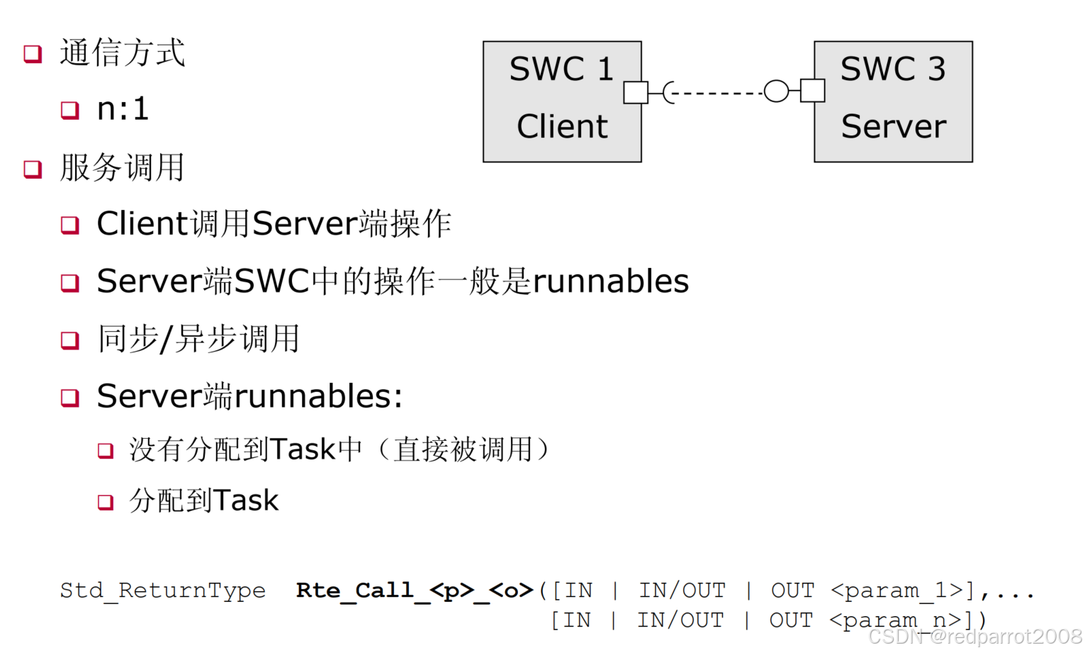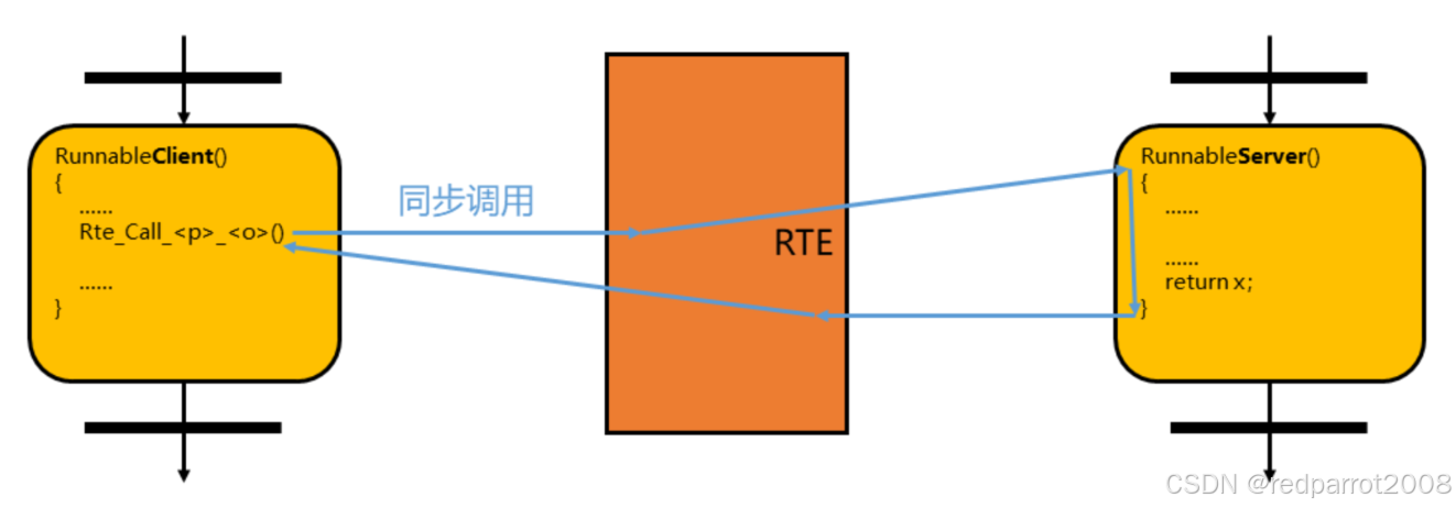 想要执行一个函数,这个函数写在别的应用侧的,但和应用侧有隔阂(SWC之间不能直接通信),这时,就悄悄告诉RTE,想要执行那个函数,RTE就会帮我告诉应用侧,让应用侧执行该函数。而这里又有两种方式:异步和同步: