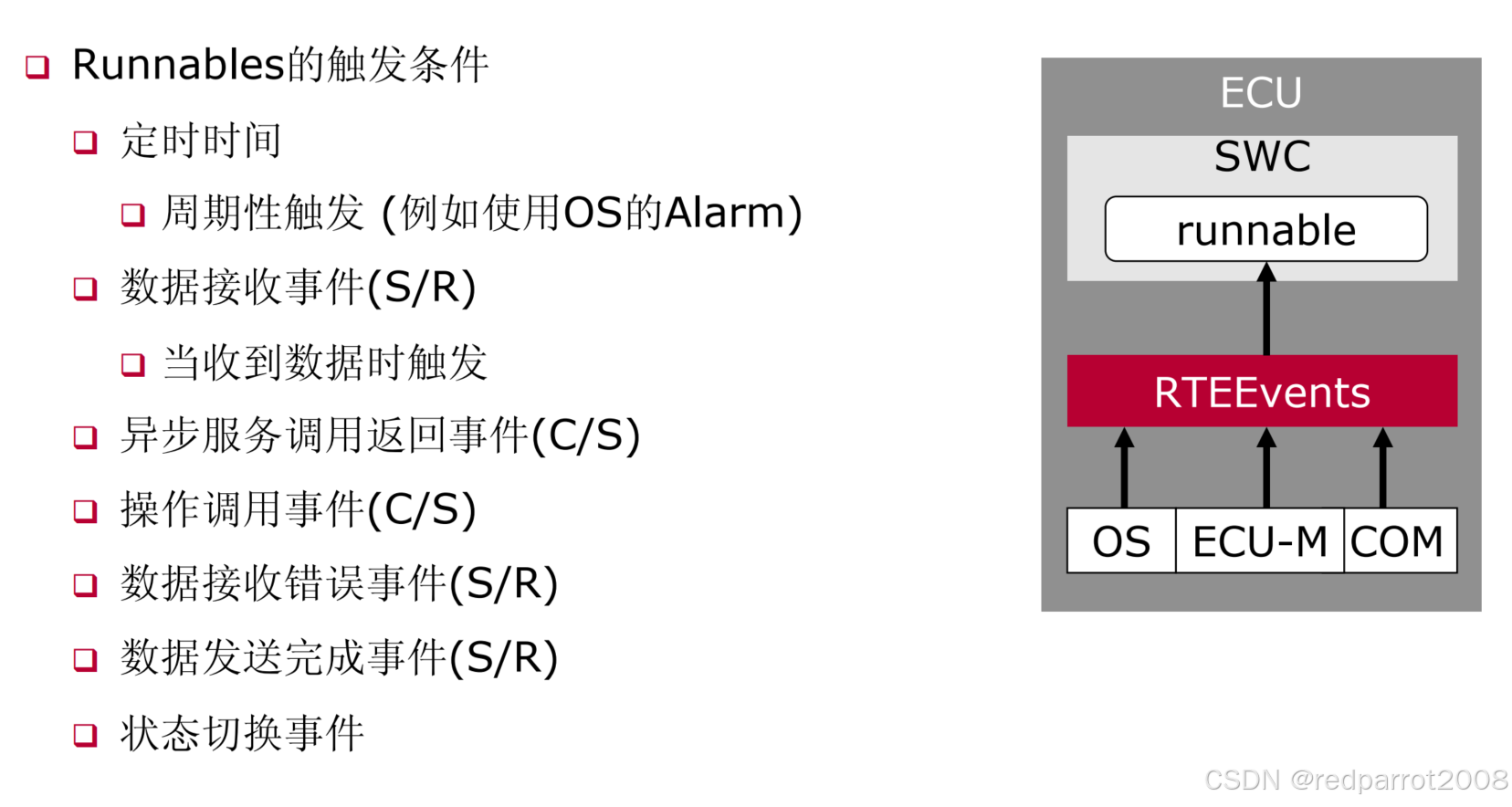 RTE给runnables提供触发条件,也就是runnable在设计的时候,需要有触发条件,不然无法运行,也就没有意义了。触发条件就是一些特定的事件,AutoSAR中主要规定了以下一些触发条件