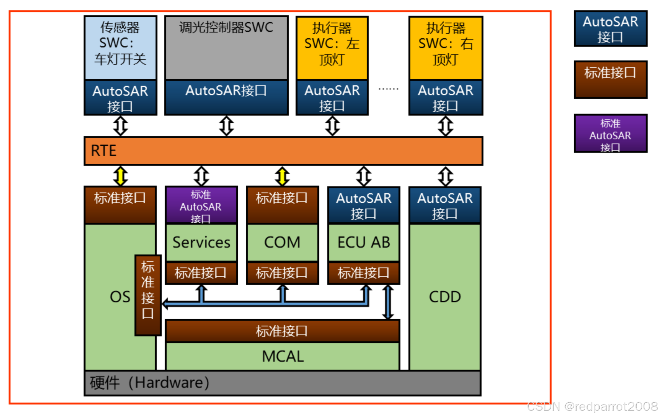 位置:SWC<>RTE、RTE<>CDD、RTE<>ECUAB(这里提一句,ECUAB之前没有讲到,其实很多的传感器、执行器都放在这里,是ECU的抽象,也是可以看作是SWC的,IoHwAb就在这里面)。说明白一点,就是只要能看成是SWC处理的,就是AutoSAR接口。