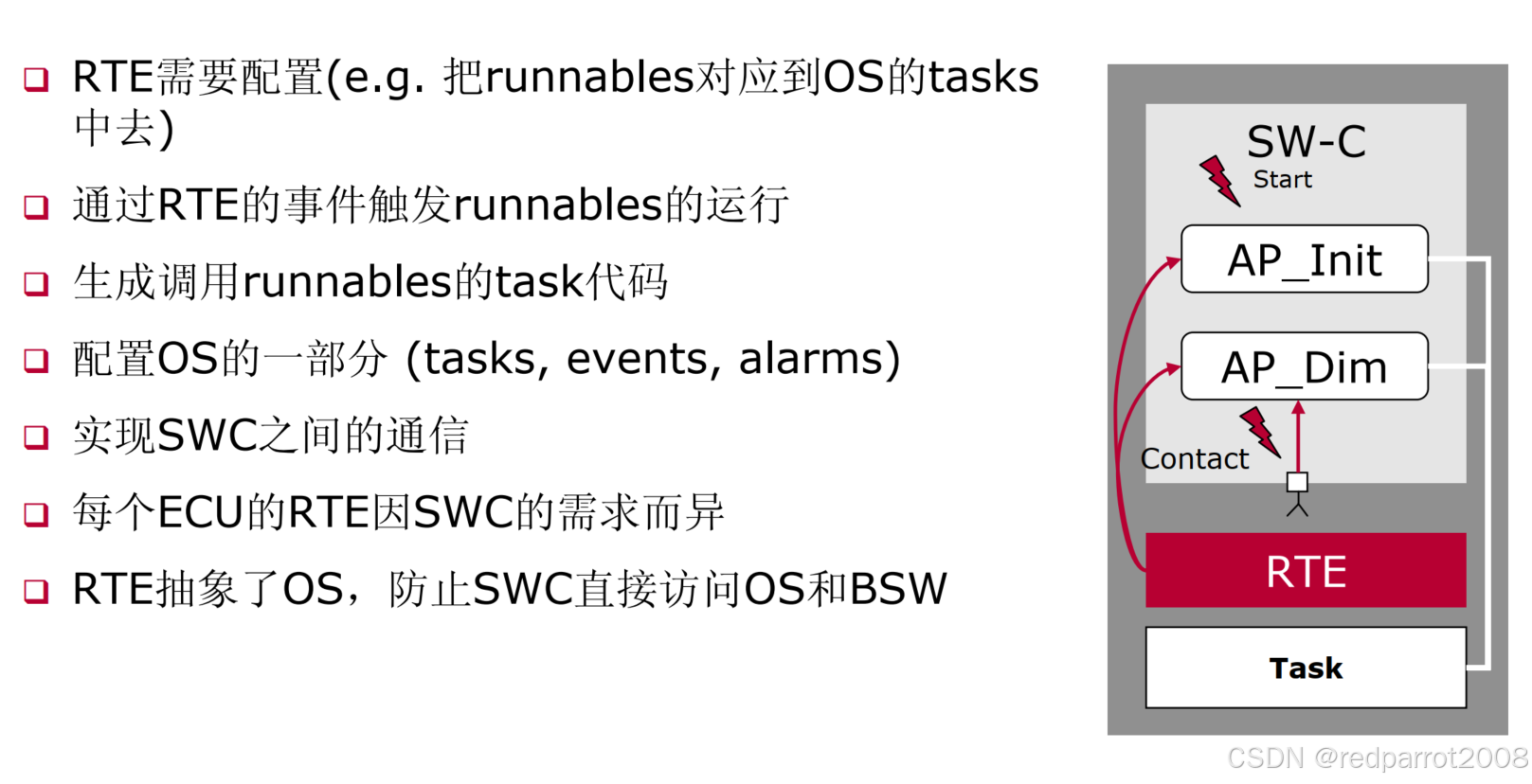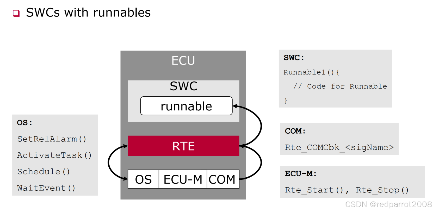 RTE抽象了OS,将BSW和SWC做隔绝,因此OS和runnables也被隔绝了,runnable的运行条件由RTE提供,不能由OS直接提供。