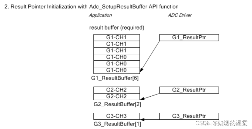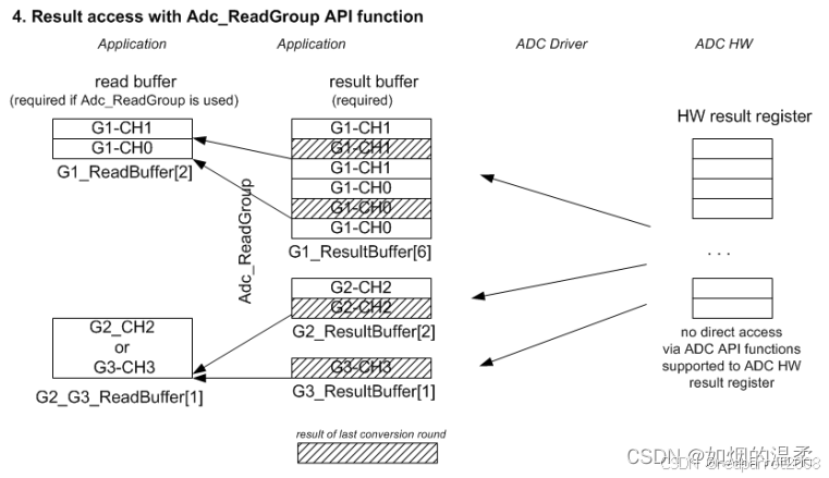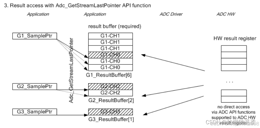 - 结果缓冲区的存储布局相反,Adc_ReadGroup的最新转化结果放在下面;而Adc_GetStreamLastPointer的最新转化结果放在上面;