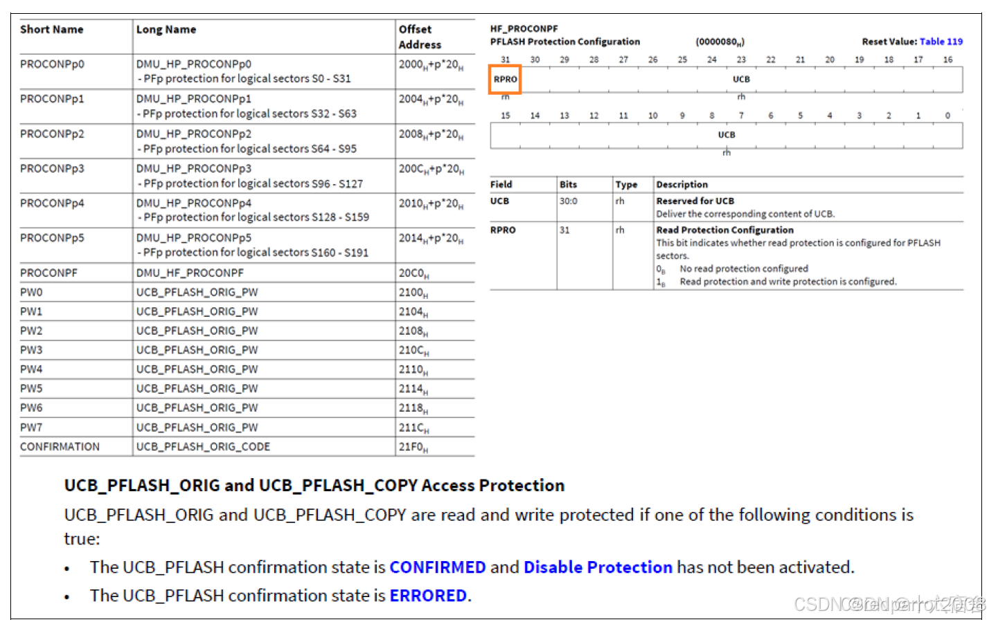 在PROCONPF寄存器里的RPRO会在启动保护之后置位。由于PFLASH读保护会同时锁定调试接口,所以必须确保DBGIFLCK=1,才能通过调试器解锁调试接口。