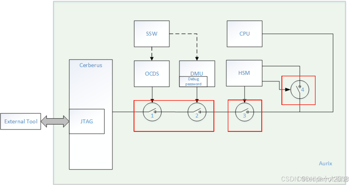上图前边的两个控制门是由TriCore来控制,分别通过OCDS或者DMU模块,而后边的两个则是由HSM核控制,通过这两个门,HSM可以锁定对Host CPU的调试访问权限,也可以关闭HSM自身的调试支持。