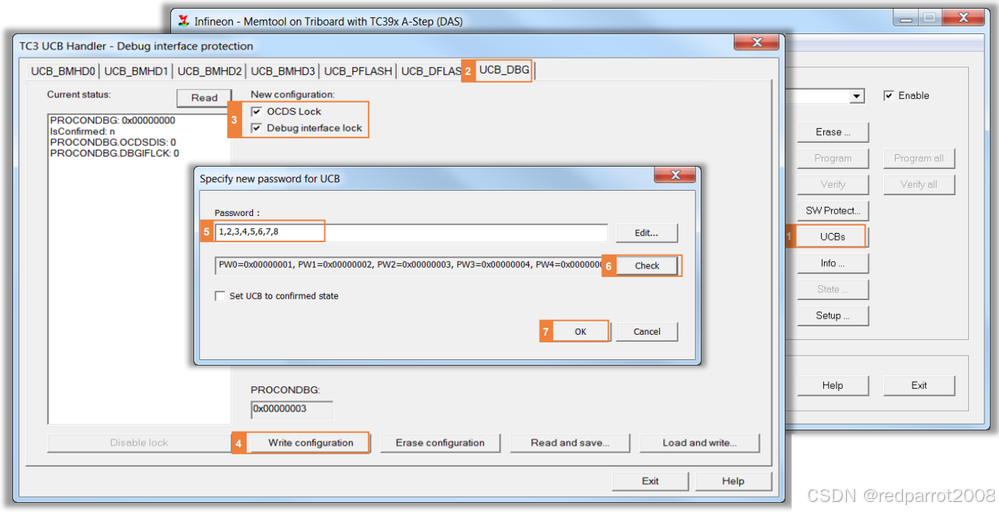 而此时在Memtool界面下,一旦UCB处在CONFIRMED状态,则就不能再改变UCB的状态了。在量产的程序中,必须改为CONFIRMED状态,因为在UNLOCK状态下,UCB的Password部分是可以读出来的(在调试器连接不上情况下,也还是可以通过 ASCBootloader 读出来)。