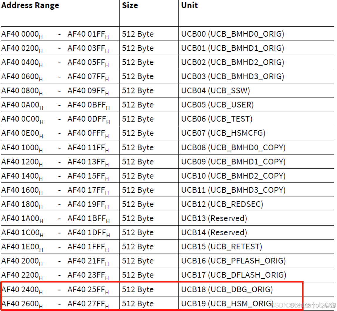 可以通过上图看到UCB18和UCB19分别对应的由TriCore核和HSM核(对应的UCB26和UCB27为UCB_DBG_COPY和UCB_HSM_COPY,图太长就不截了)。