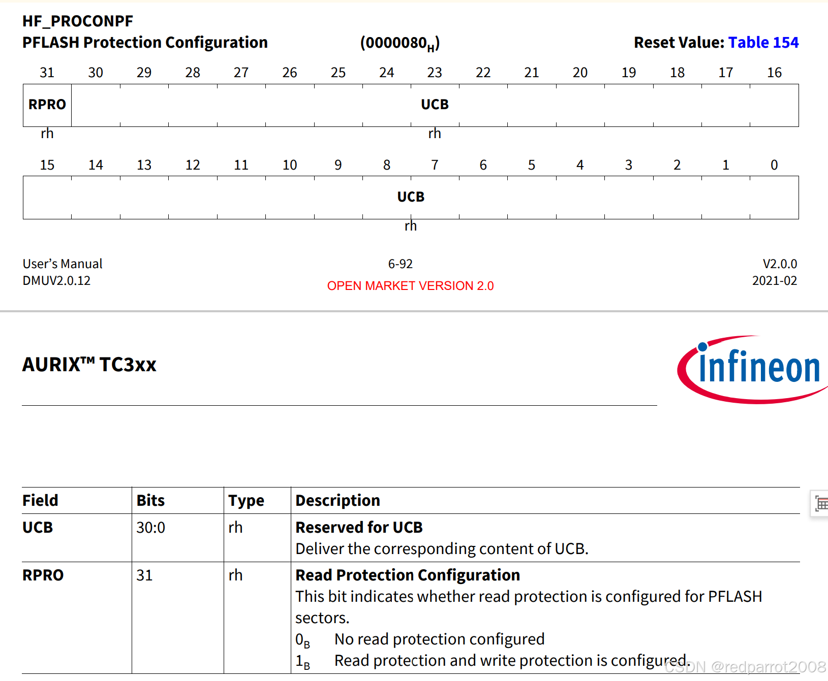 在这种情况下(RPRO=1 且 DBGIFLCK=0),只能通过 TC3XX 应用代码执行 “DISABLE PROTECTION” 命令序列来解锁,