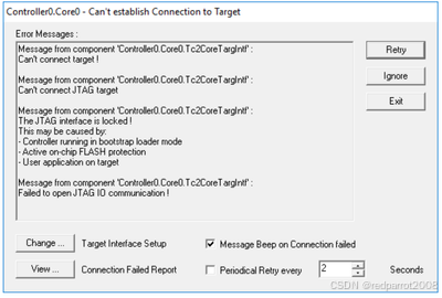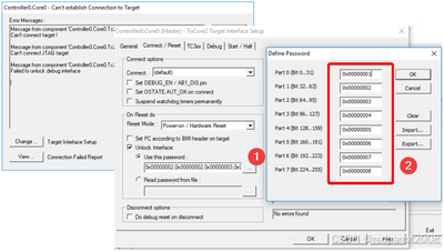 连接调试器时,如果出现报错,请点击 MEMTOOL 中的 CHANGE 按钮,然后选择 CONNECT/RESET 标签页,点击 UNLOCK INTERFACE,输入 8 个 WORD(每个 WORD 4字节)作为密码,最后点击 OK 即可解锁。如图: