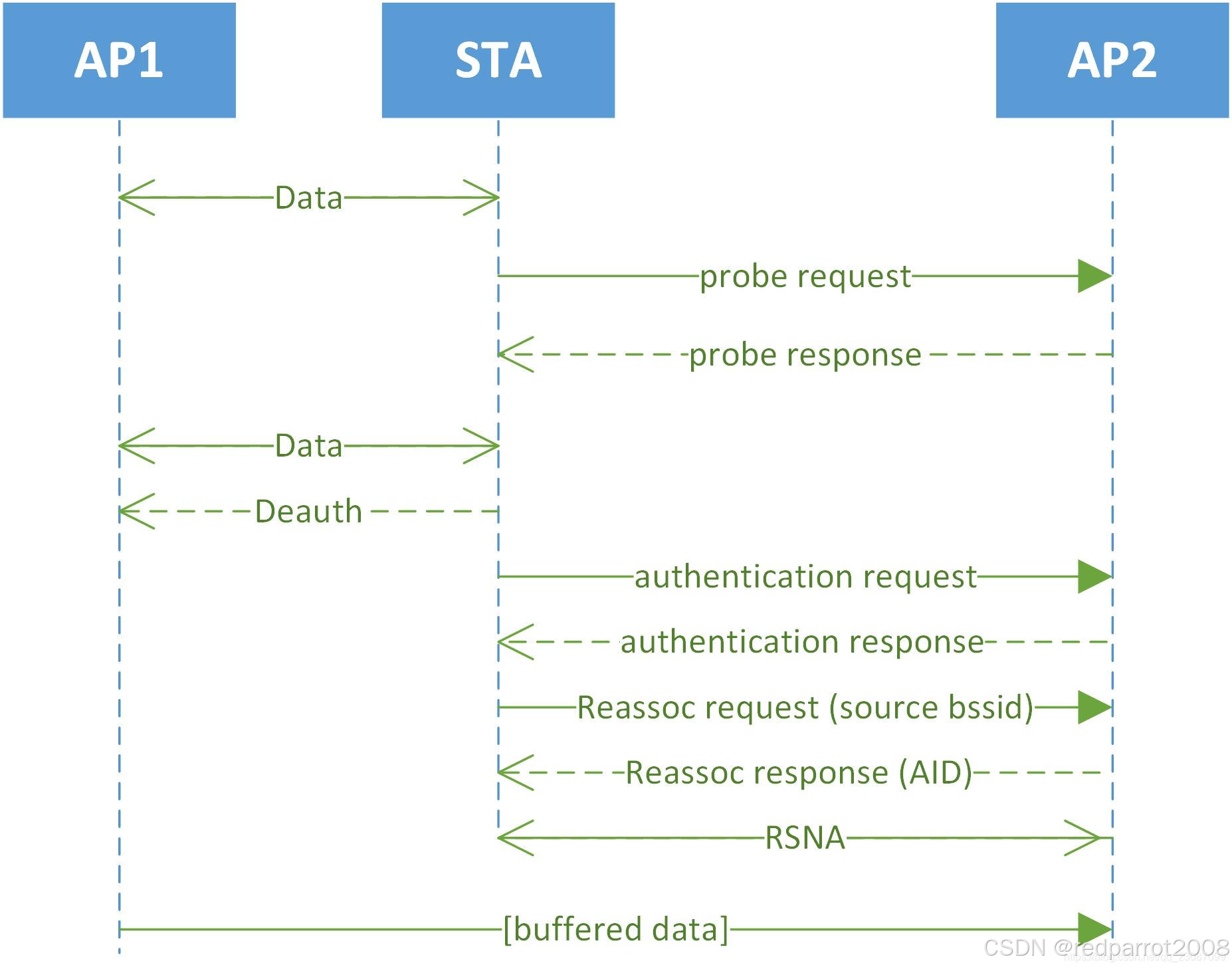 Roaming指STA从一个AP associate到另一个AP(并不要求在同一ESS)。基本流程如下图。