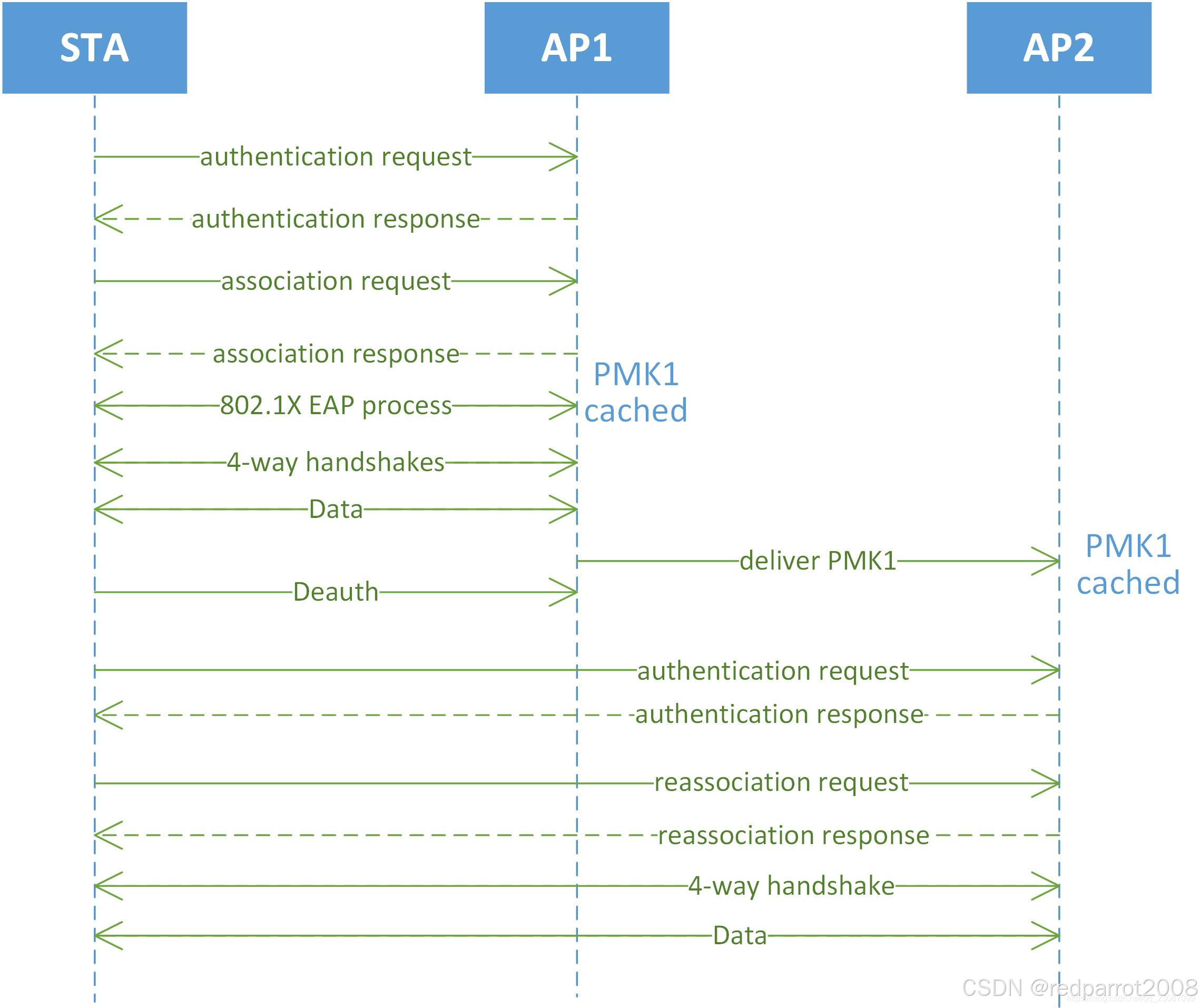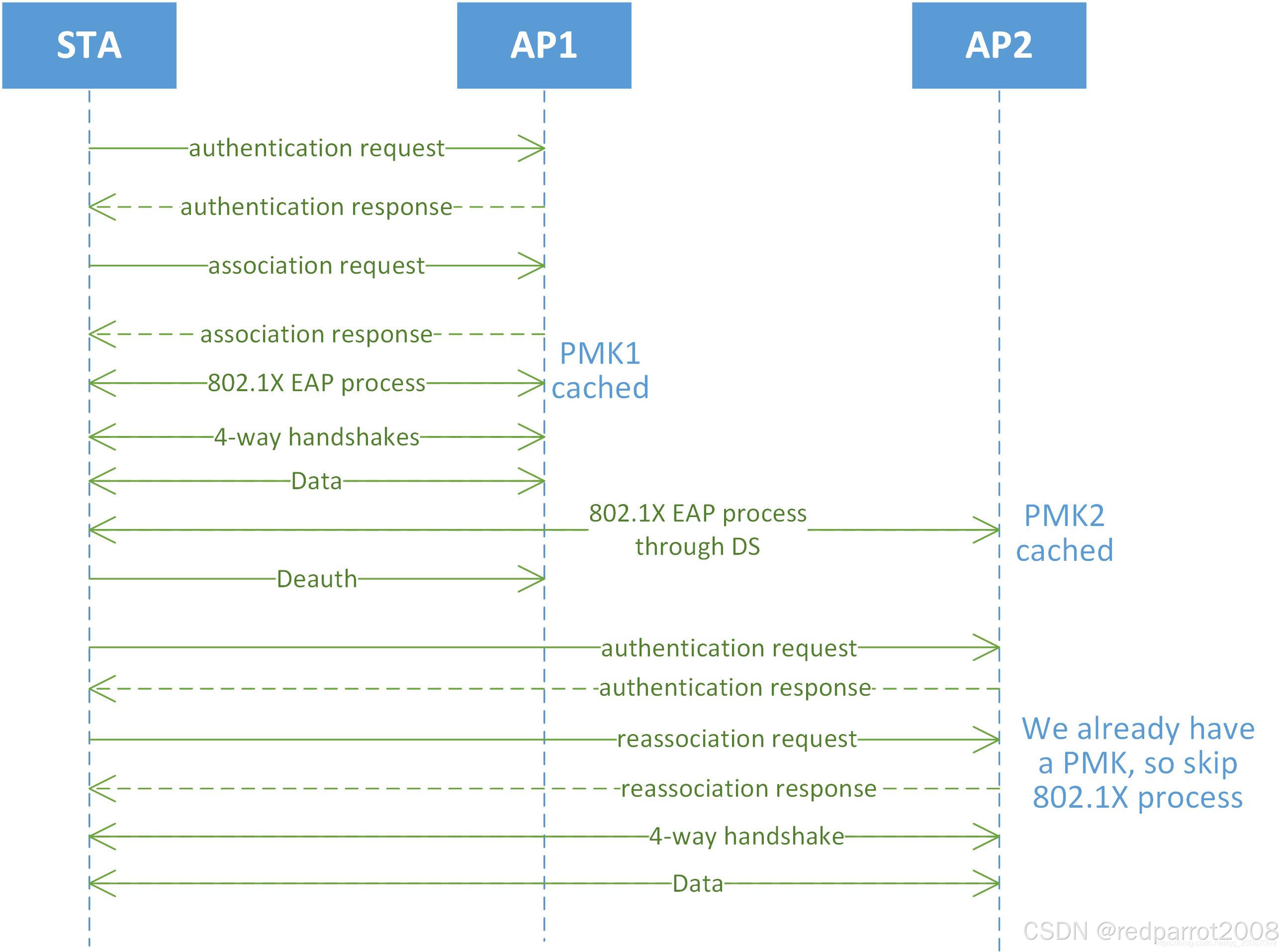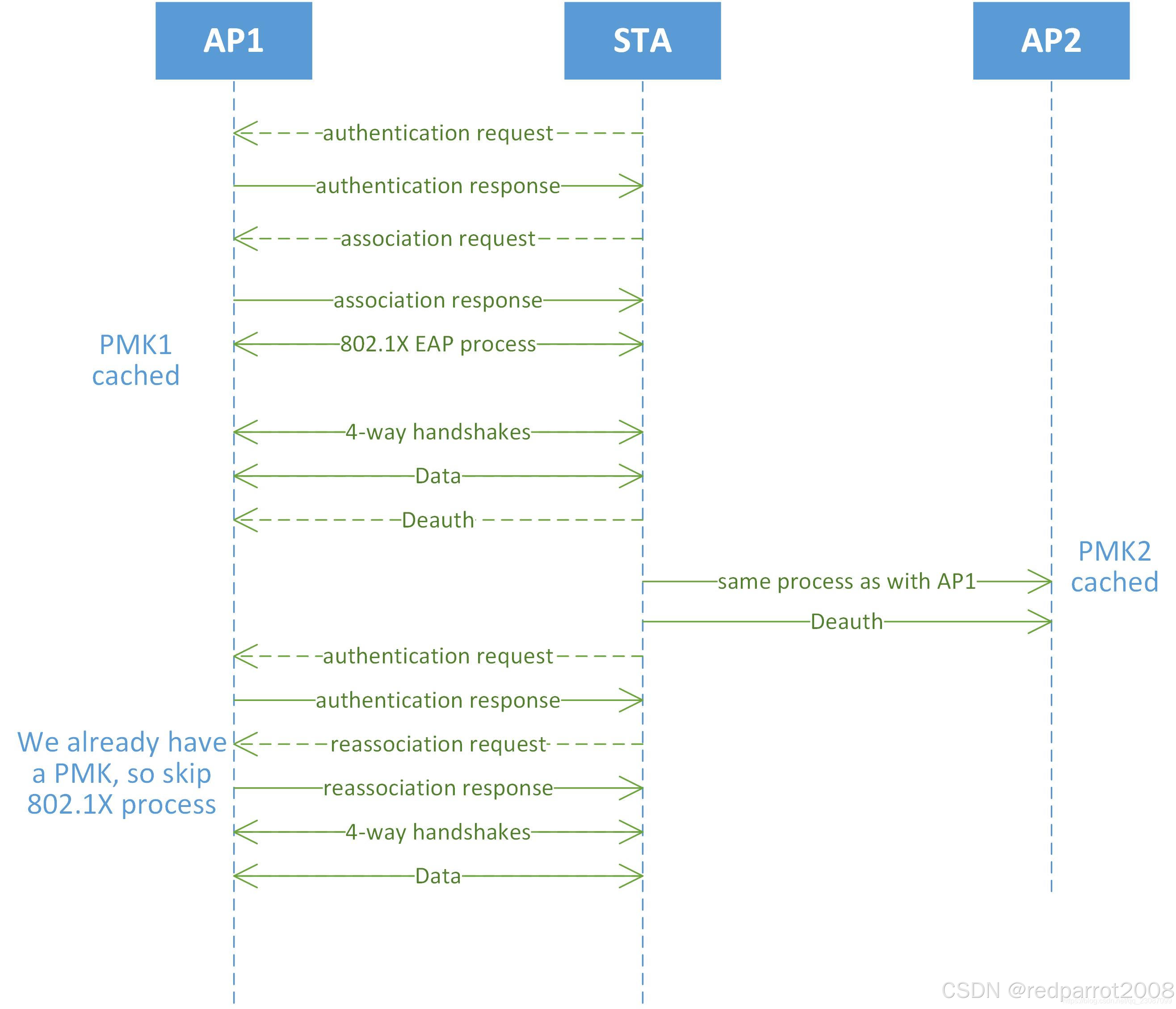 指当STA和ESS中的一个AP关联后,可以通过该AP和ESS中的其他AP完成802.1X认证,从而生成和其他AP的PMKSA并缓存。当STA向其他AP发出关联请求时,若PMK仍然有效,则跳过802.1X认证直接进入4-way handshake过程。Pre-authentication的一个问题是进行了太多无效的802.1X认证,缓存了太多无用的PMK:可能每个STA都存着ESS中所有AP的PMKSA,每个AP也存着所有连接过该ESS的STA的PMKSA。