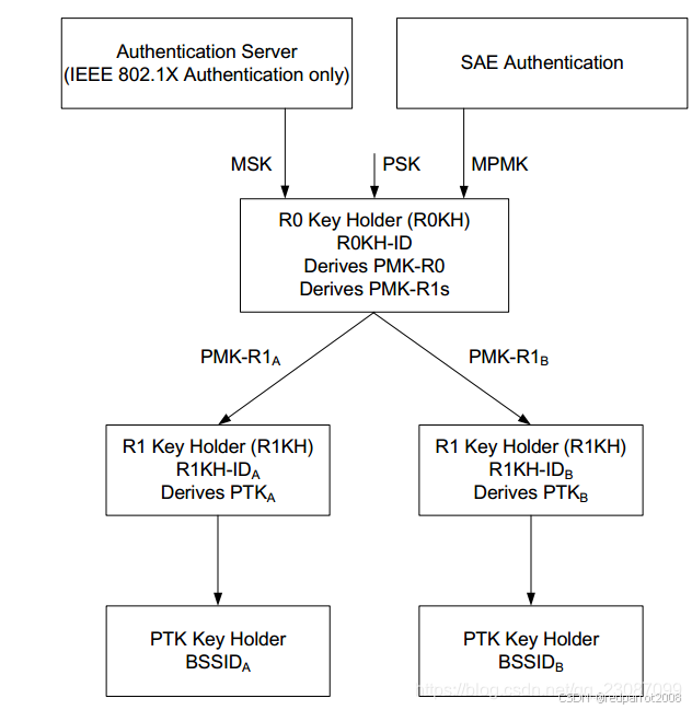 FT在802.11r标准被定义。它将密钥分为几个层次: