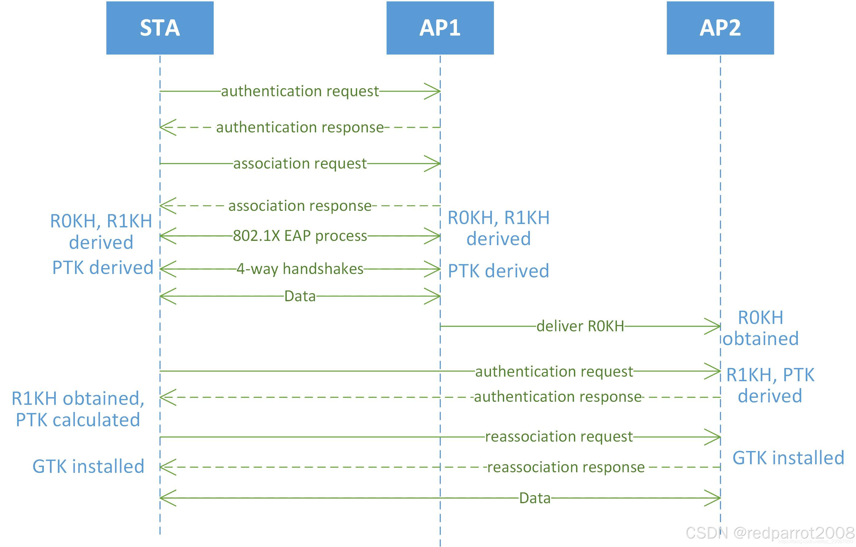 其中,PMK-R0是一个STA和一个MD(mobility domain,可以理解为一个ESS范围内)对应的;PMK-R1是一个STA和MD中的一个AP对应的;PTK则是临时会话密钥。当STA和MD中的一个AP关联之后,生成的PMK-R0由Authentication server保存,随后计算并分发各个AP的PMK-R1。R0KH即WLAN Controller,R1KH即ESS中的AP们。当STA准备Roaming到其他AP时,在authentication/reassociation帧中附带相关信息用于生成PTK,这样就省去了4-way handshake流程了。