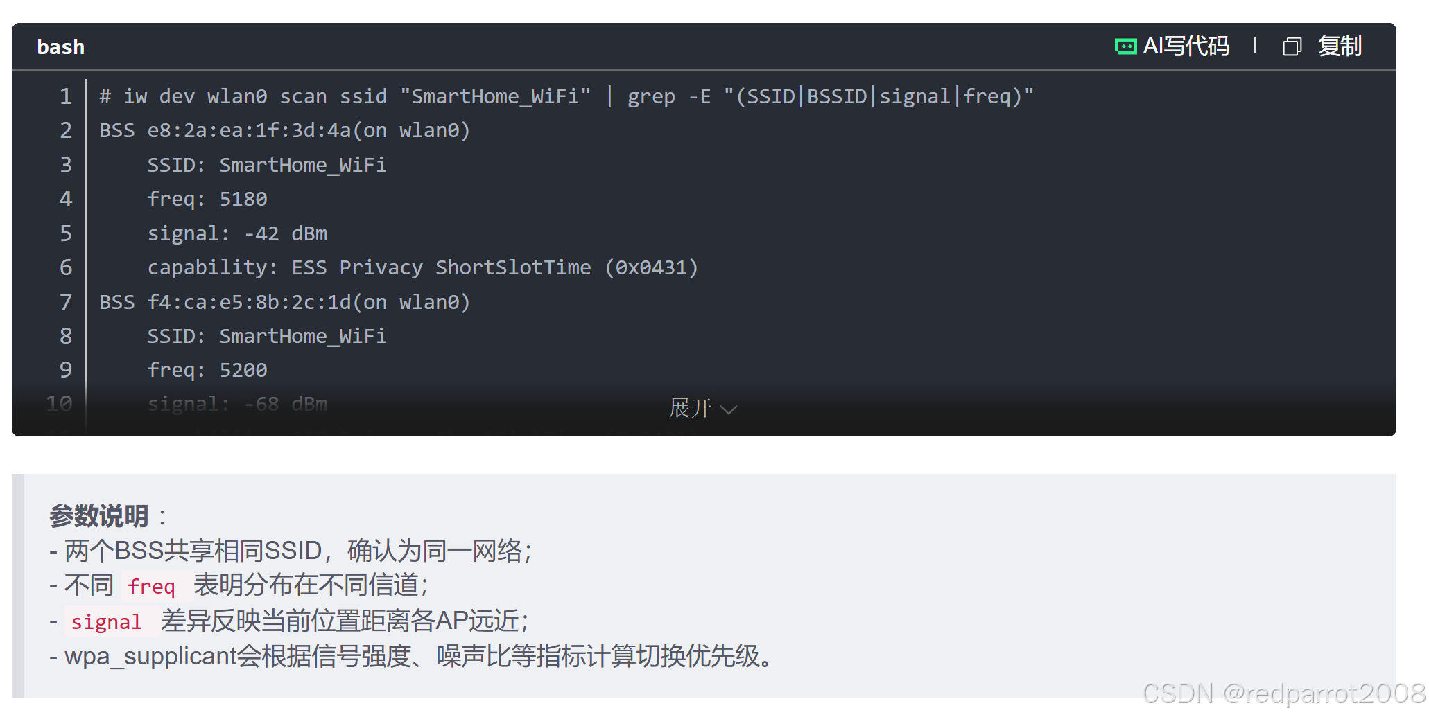 值得注意的是,某些低端路由器固件存在“克隆BSSID”问题——即多个节点使用相同BSSID,这会导致Linux内核mac80211子系统误判为同一AP,从而拒绝执行切换操作。可通过以下命令检测是否存在重复BSSID: