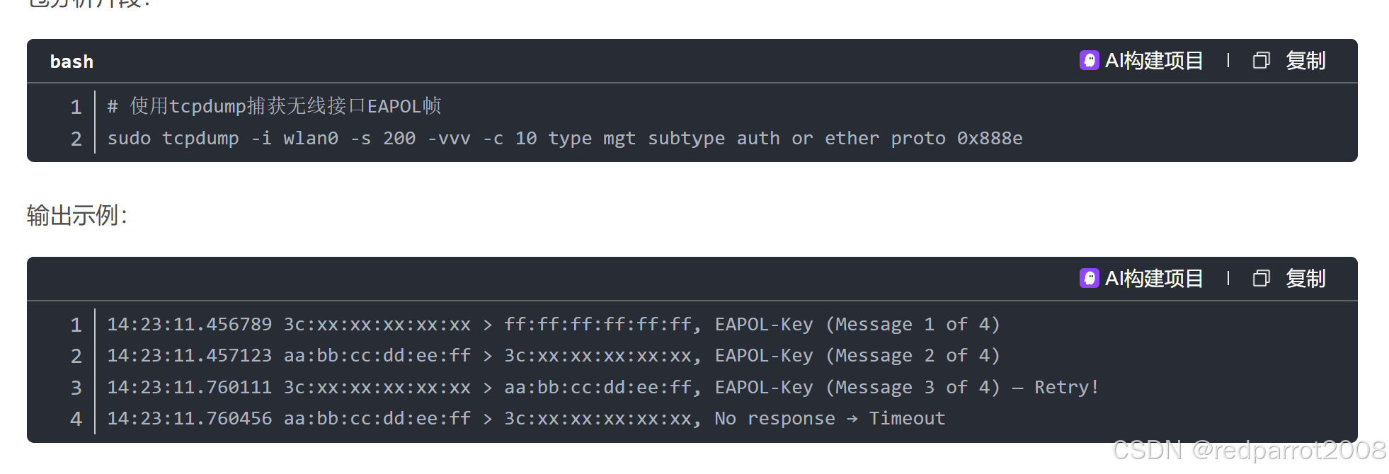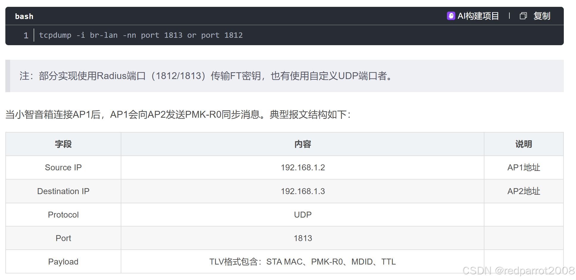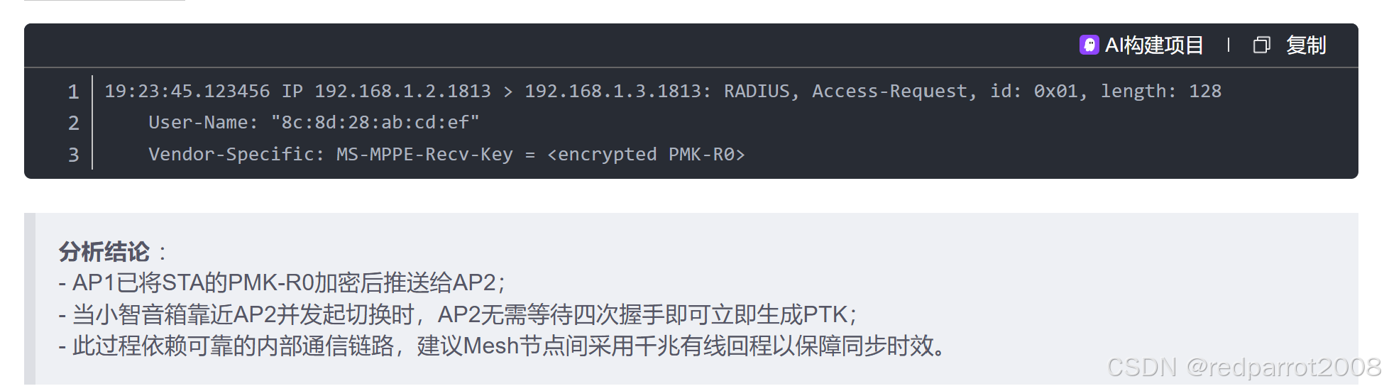 为验证密钥同步机制是否正常运作,可在骨干网络上使用tcpdump捕获hostapd间的消息交换。假设两个Mesh节点通过LAN互联,IP分别为192.168.1.2(AP1)和192.168.1.3(AP2)。