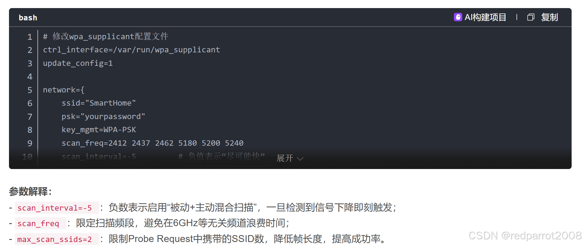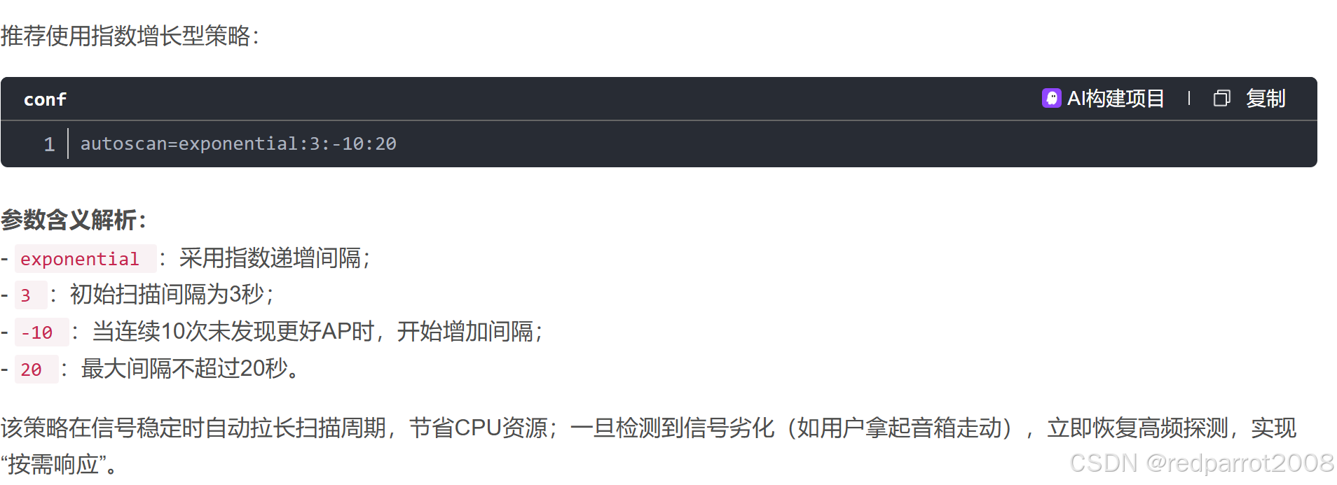 wpa_supplicant内置 autoscan 模块,可根据环境动态调整扫描频率,避免固定周期带来的资源浪费。