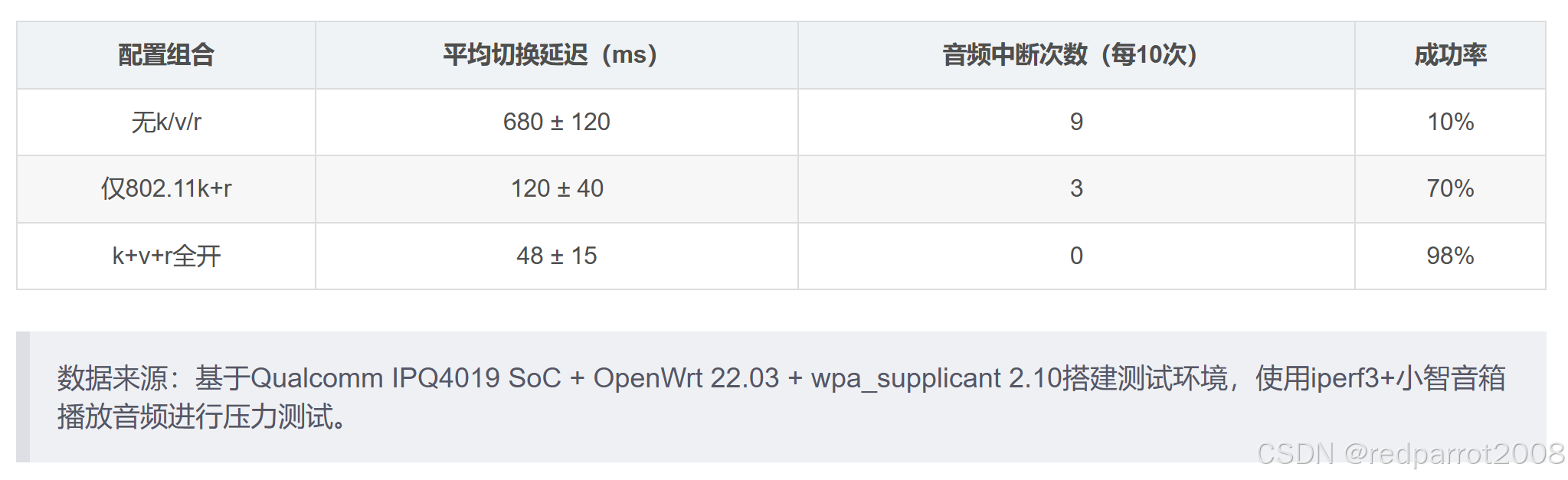 表格数据表明,启用完整802.11k/v/r协议族后,小智音箱在网络切换期间实现了真正的业务连续性。