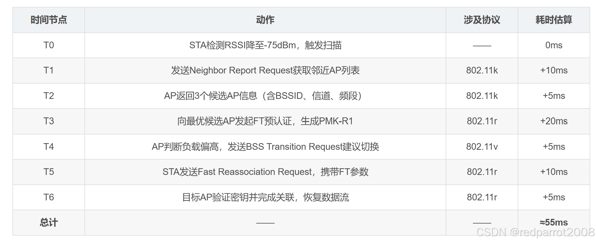 目标AP验证成功后,立即分配链路并恢复数据传输,整个过程通常在10~50ms内完成。