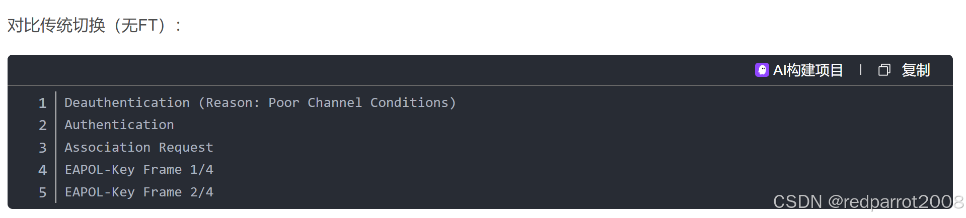 一旦终端决定切换,它不再执行完整EAP握手,而是直接发送带有FT参数的Reassociation Request帧,其中包含: