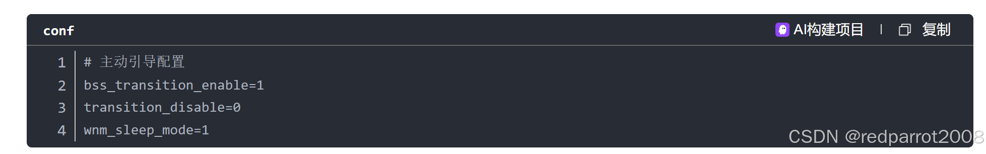 conf network={ ssid="SmartHome" psk="..." key_mgmt=WPA-PSK disable_ht40=1 bss_transition=1 # 启用BSS Transition Management }