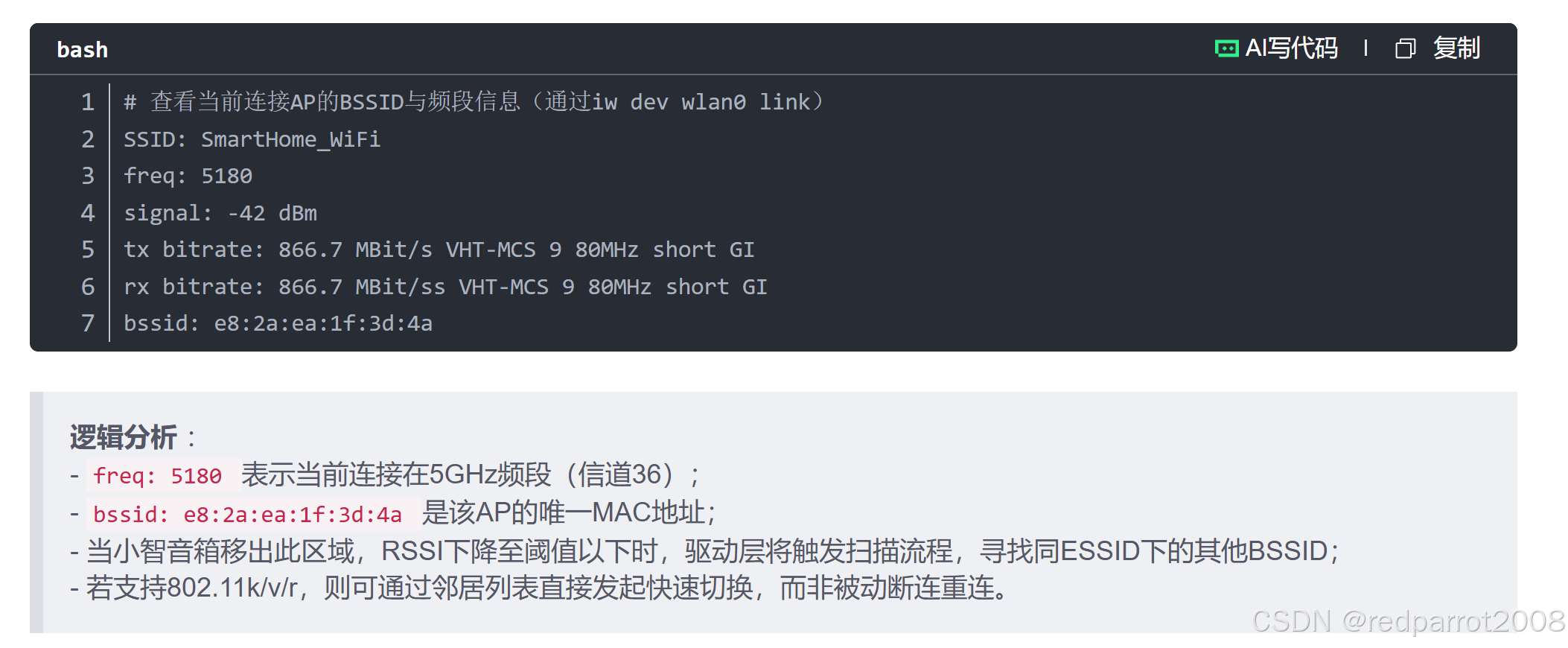 Wi-Fi漫游通过让设备在不中断连接的前提下,从一个AP切换至另一个AP,实现全屋无缝覆盖。其基础机制依赖三大要素: RSSI监测、BSSID识别与AP发现 。当小智音箱检测到当前信号强度(RSSI)低于阈值(如-70dBm),便触发扫描周边AP,并依据信号质量、信道干扰等参数选择最优目标。