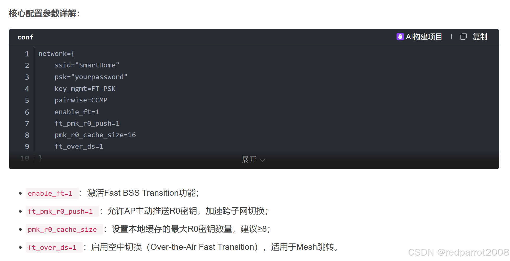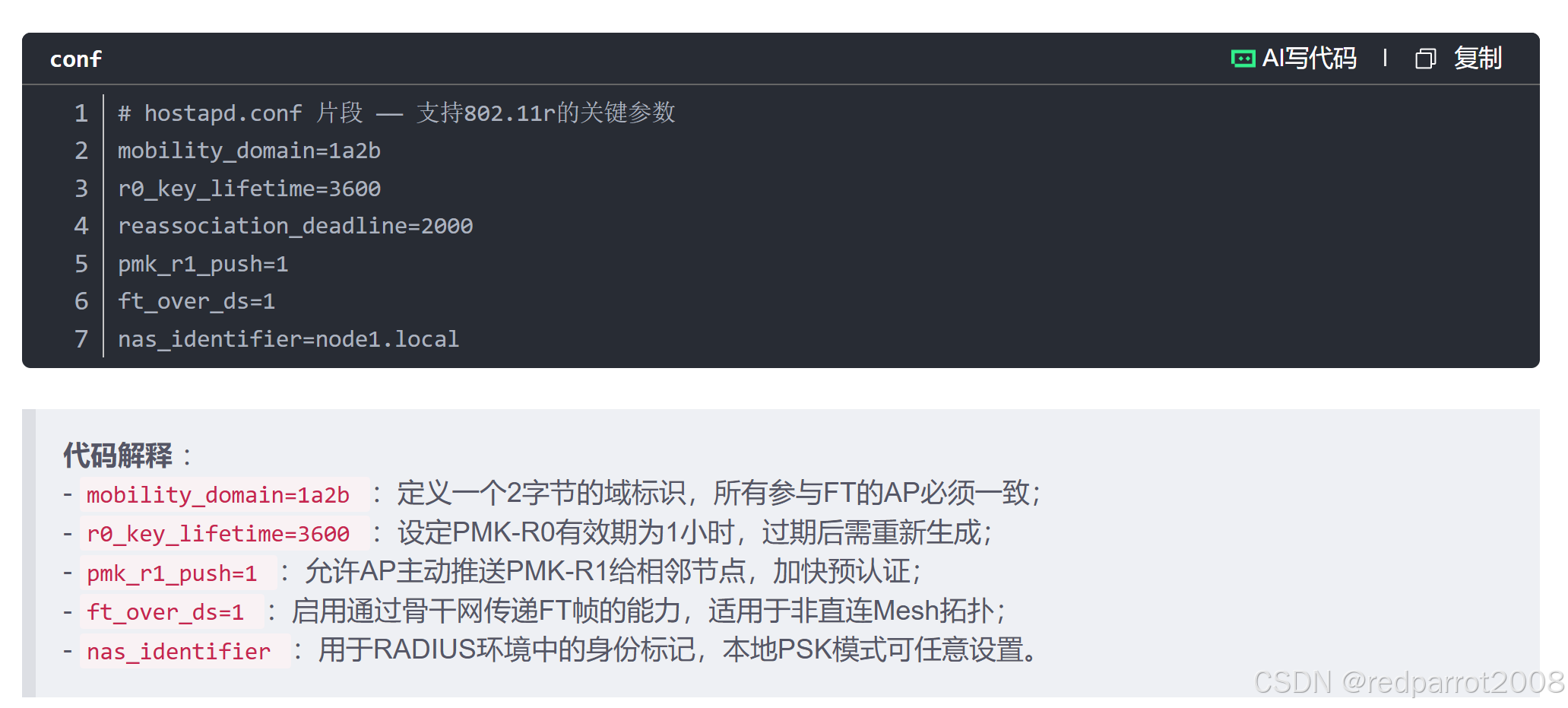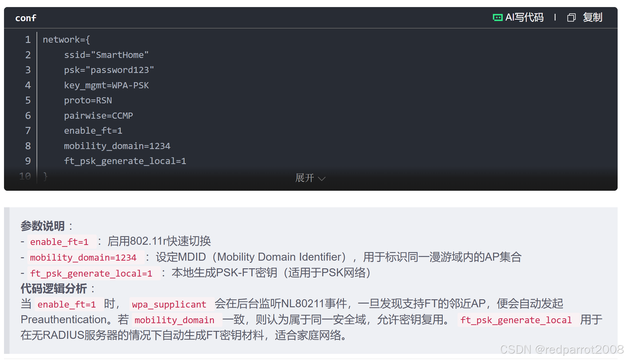 以下为 wpa_supplicant.conf 中启用802.11r的关键配置项: