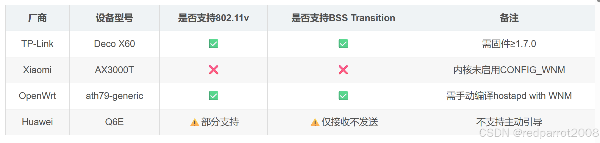 在真实家庭环境中,用户可能混用华为AX3 Pro、TP-Link Deco X20、小米AX1800等多种品牌设备,各厂商对802.11k/v/r的实现存在差异,甚至违反标准定义。