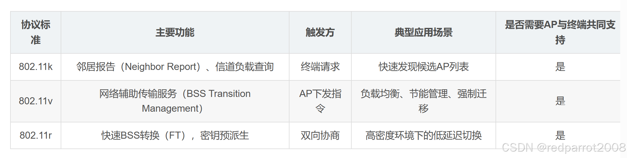 2.1 802.11k/v/r协议的功能分工与协同机制