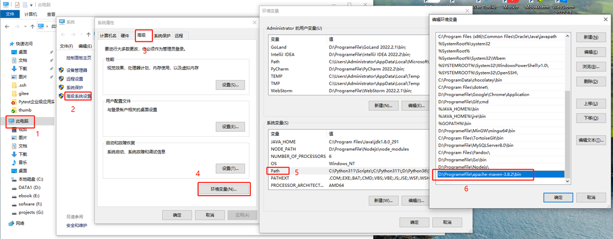 在【此电脑】上右键-【属性】,然后【高级】-【环境变量】,然后找到Path,并双击打开,将maven的路径配置进去,比如这里为:D:\ProgrameFile\apache-maven-3.8.2\bin