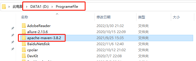 (4)然后将压缩包解压,将解压后的文件夹拷贝到一个固定位置,maven实际并不像其他安装程序有个安装过程,maven实际只需要将文件夹拷贝到固定位置,然后配置环境变量就好了,因此这里拷贝到程序安装的目录下,比如D:\ProgrameFile 目录下,如下