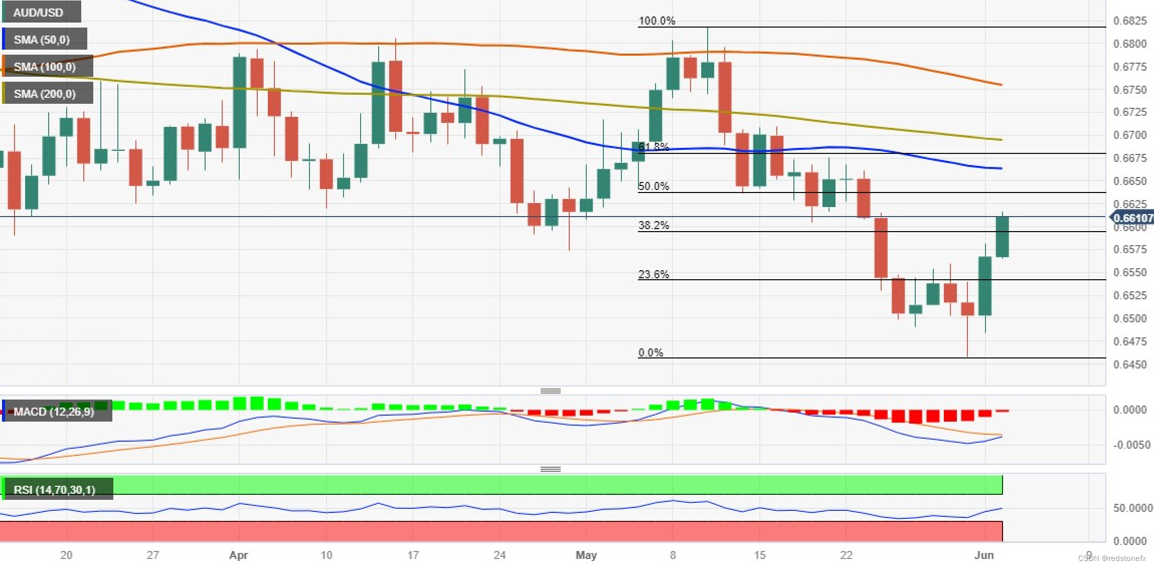 从技术角度来看,持续突破0.660关口,与5月下跌的 38.2% 斐波那契回档位重合,可被视为看涨交易者的新触发点。 此外,日线图上的震荡指标已从负值区域恢复,并支持延续本周自2022年11月以来最低水平的强劲反弹的前景。因此,随后突破 50% 斐波那契0.6640 区域附近的水平,在通往 50 天简单移动平均线的途中,看起来很有可能。 下一个相关障碍位于0.6690 汇合点附近,包含 61.8% 斐波纳奇位和 100 日均线,如果果断清除,应该为近期的额外上行铺平道路。