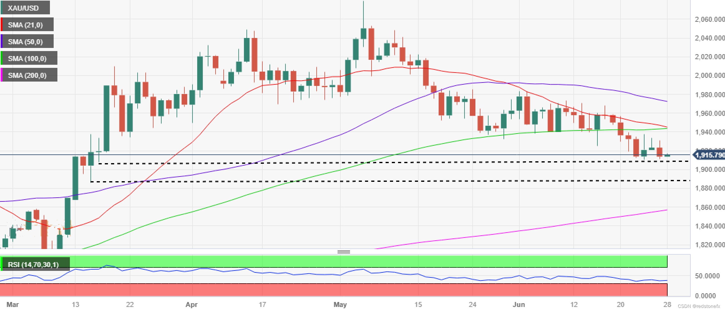 黄金交易者似乎正在关注日线图上即将出现的熊市交叉,这证明了金价最近的下跌是合理的。黄金等待日收盘时确认熊市交叉以延续看跌势头。 向下倾斜的 21 日移动平均线正处于从上方切断 100 日移动平均线的边缘。与此同时,14日相RSI潜伏在中线下方,表明黄金仍存在下行风险。直接支撑位于 3 月低点 1908 美元,低于该水平将向上突破 1900 美元关口。 再往下看,1886 美元将成为黄金买家的底线。