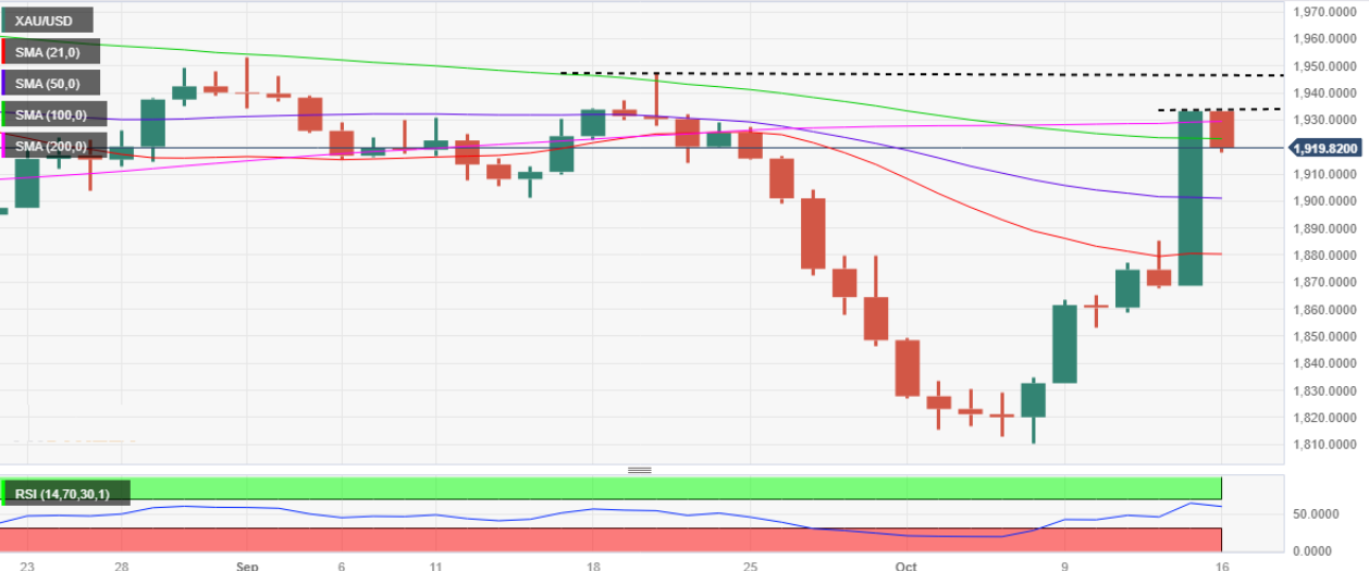 金价正在回撤上周五飙升至三周以来最高水平1933美元的一部分。美元保持守势,而美债收益率小幅走高,原因是投资者考虑到以色列和哈马斯之间持续的冲突以及周末的新事态发展。上周五,金价出现了100美元的反弹,受周末地缘政治不确定性的影响,投资者纷纷避险。此外,由于预期正在进行的哈以战争可能使金价保持上行风险,投资者开始回补空头头寸。在美盘中,金价从1832美元跳涨至1933美元,创下三周以来的新高。