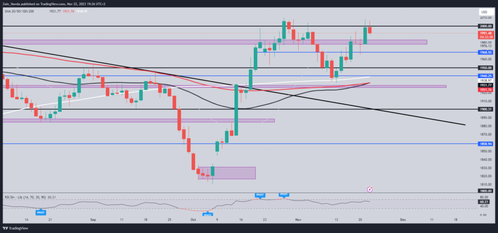 黄金价格在2000美元关键水平上遇到压力,美元上涨和国债收益率反弹构成阻力。感恩节假期流动性降低,市场谨慎。技术分析显示混合信号,小时间框架交易者可能更有利