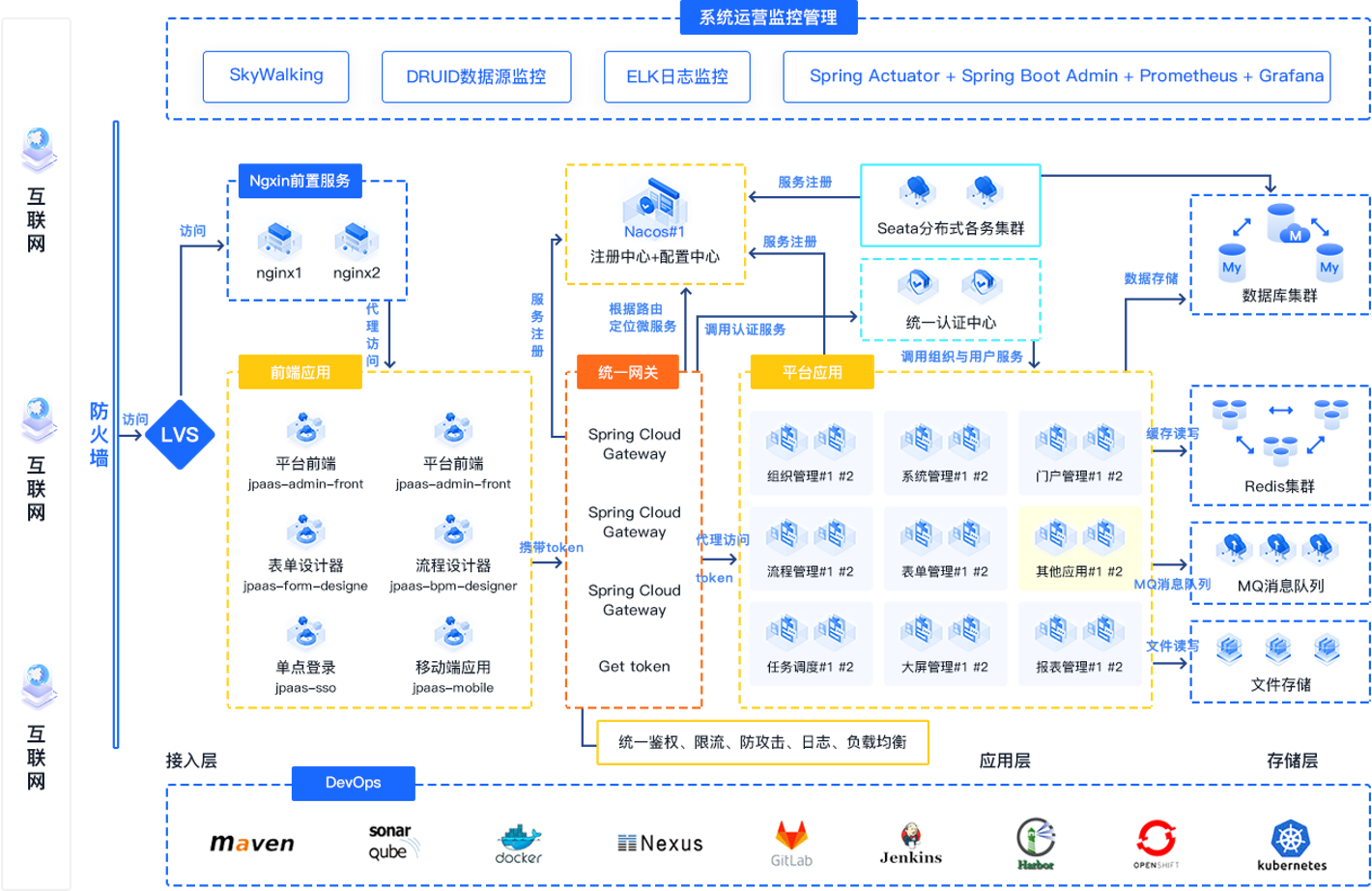 在分布式架构方面,平台利用 Nacos/Sentinel/Spring config 实现统一注册中心和配置管理,通过 Xxl-job 进行分布式调度,采用 Seata 处理分布式事务,确保了系统在分布式环境下的一致性和可靠性。同时,集成了 RocketMQ、ActiveMQ、Kafka 等 JMS 消息中间件,实现了系统间的异步通信,提高了系统的解耦性和可扩展性。