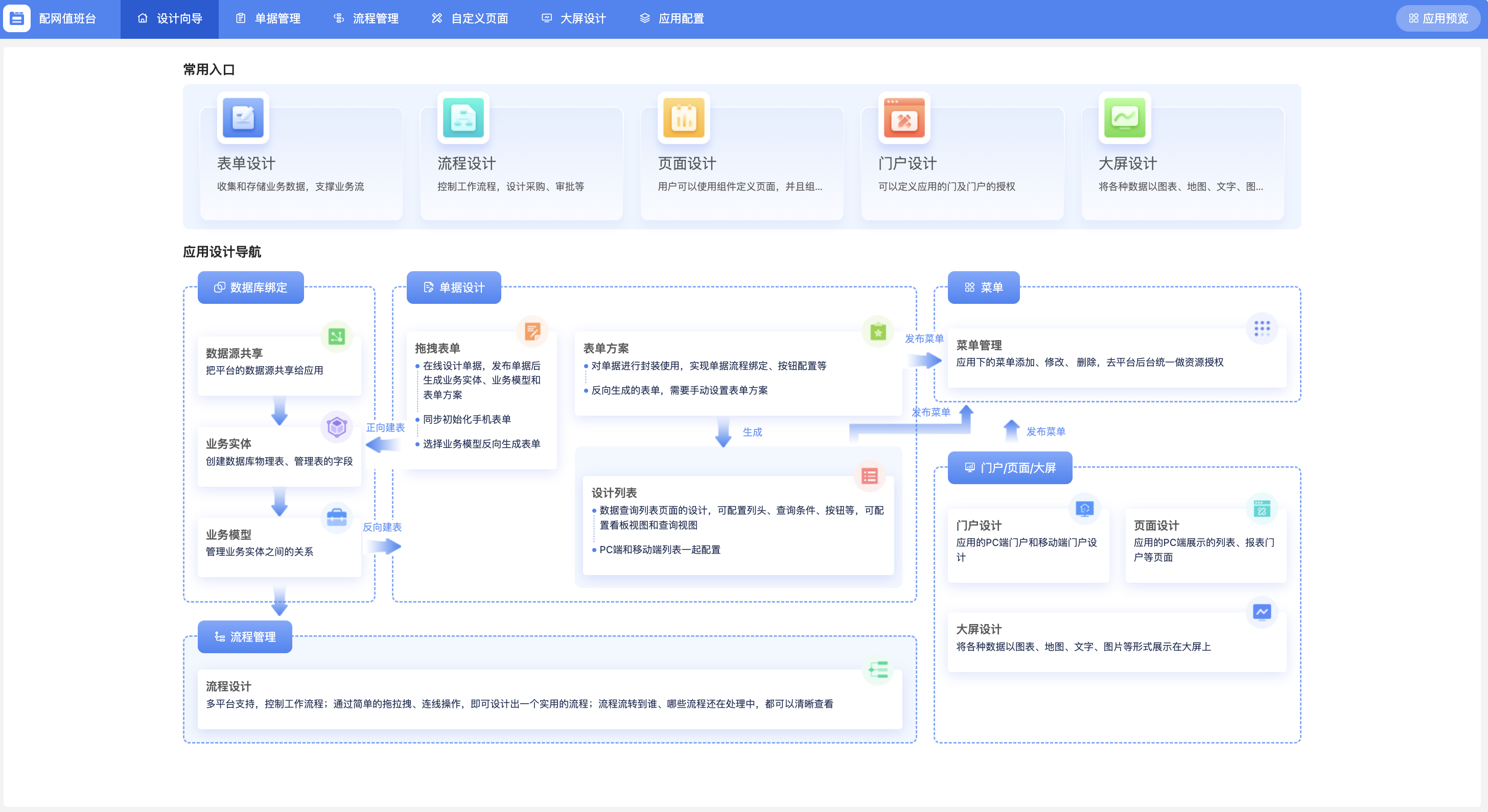 平台提供了一系列可视化开发工具,包括表单设计器、流程设计器、列表设计器、页面设计器、门户设计器和大屏设计器等。
