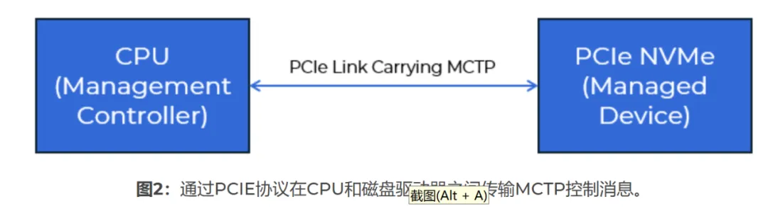 为了进一步解释,请想象一个系统主板,该系统主板包含通过PCIE插槽连接的固态磁盘驱动器。磁盘驱动器是MCTP上下文中的托管设备。并且,可以通过PCIE协议本身在CPU和磁盘驱动器之间运输MCTP控制消息。这在图2中示意性地说明了这一点。