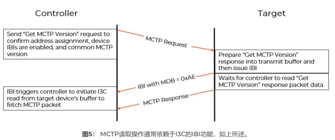 上面的读取示例在图5中以图形方式说明。请注意,IBI请求包括一个强制性数据字节(MDB),其值为MCTP数据包保留。
