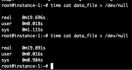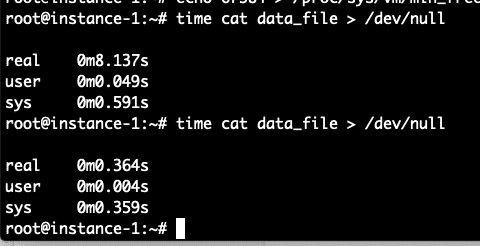 As one final validation let’s reduce the vm.min_free_kbytes to allow the page cache to have more room to operate and we can expect to see the cache working and the file read getting much faster.