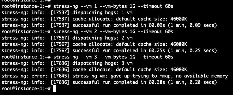 # stress-ng --vm 3 --vm-bytes 1G --timeout 60s