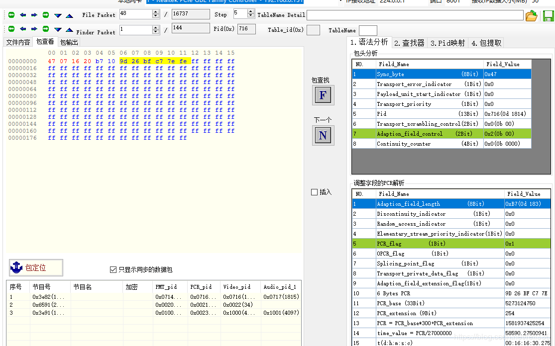 adaption_fields() //调整字段的处理:当 PCR_flag=1,则表示本调整字段包含PCR包,可用于统计并计算码率