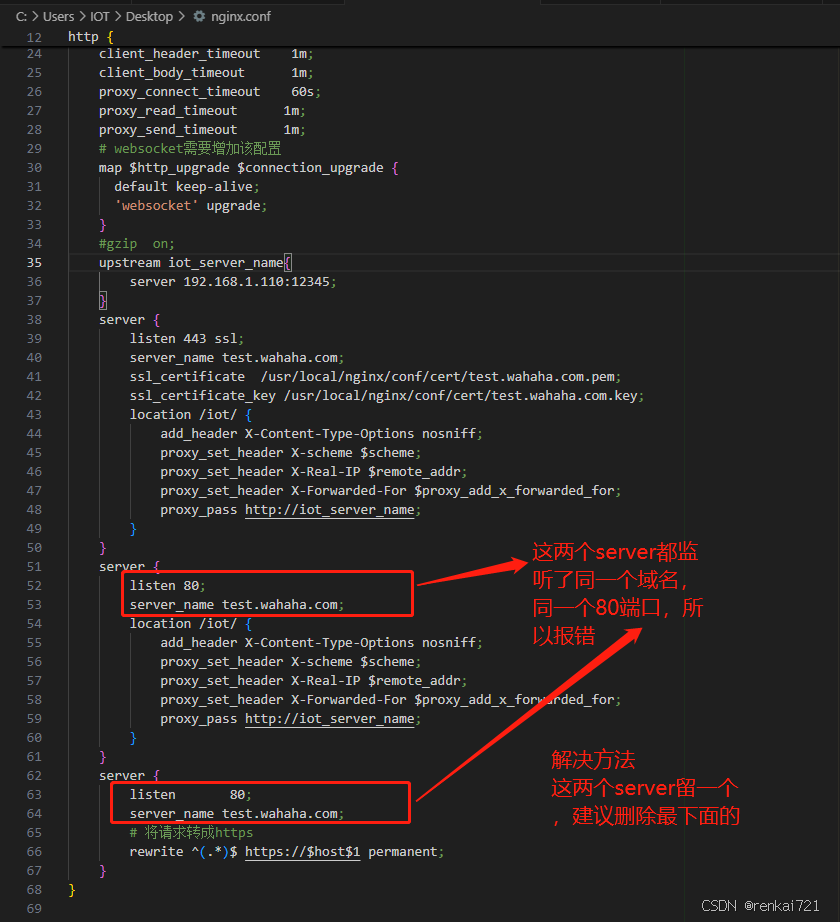 下图的配置文件中可以看出,想要支持https,也要支持http,但是第三个server是强制把http转换为https。就是用户在浏览器中输了http://test.wahaha.com按下回车之后,系统就会自动跳转到https://test.wahaha.com。如果要实现这个功能,只要留下server1和server3即可,不需要单独配置http。