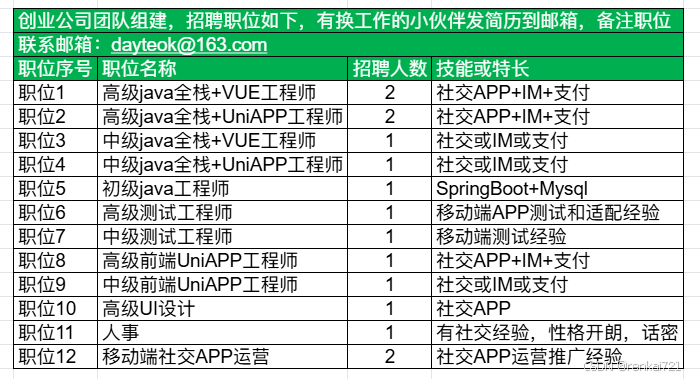 创业公司团队组建,招聘职位如下,有换工作的小伙伴滴滴。正式面试的时候会打电话通知。只接受上海。