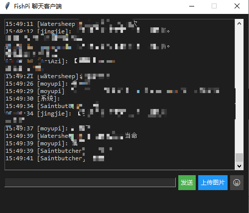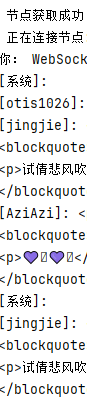 因为是小编自己写的一个隐蔽的窗口,因为隐私的原因所以展示这么多(也就是[用户]:<p>语言</p>),因为这是在python控制台展示的所以相当隐秘,但是缺点很明显就是你在控制台输入 的时候别人发信息就会导致你换行,输错字的时候他就会删除不了